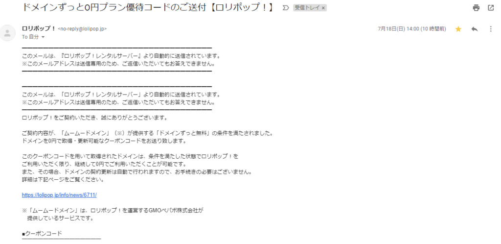 下のほうの見切れてるところに、クーポンコードが乗っていてこれをムームードメインのHPにて処理することで、ドメイン費用が「ずっと0円プラン」を利用して、無料でドメインを使えるようになるようです!お得過ぎます・・!