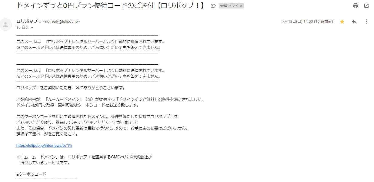 そしてここでムームードメインが登場する訳です! クーポンコードを利用することで、指定されたドメインをロリポップのサーバー契約が続く限り、更新が無料になるとのことなので、是非是非利用してみてくださいませ。 説明文によると、10日間無料期間がありますが、自動更新設定にしておくと7日目で自動的に契約料の引き落としが実施されます。 上記対応後、ロリポップ!の管理ドメインから、ムームードメインのドメインに移行する必要があるので、ムームードメイン側のDNS設定を行ってくださいませ。 詳しい内容はセットアップ方法等が説明されていますので、そちらをご参照くださいませ。 記事は以上となります! ドメインが変わったので当然URLが変更になりました。 今後ともよろしくお願いいたします。 それでは!