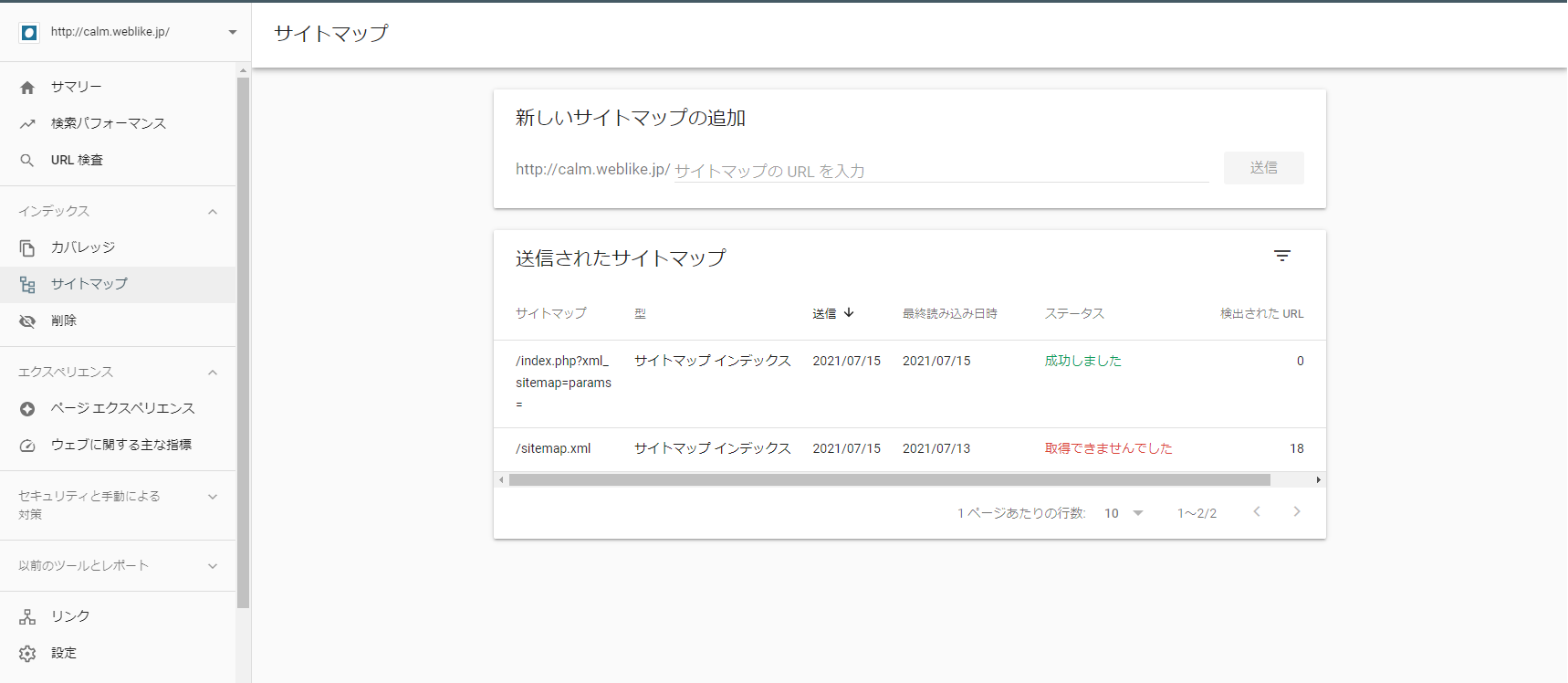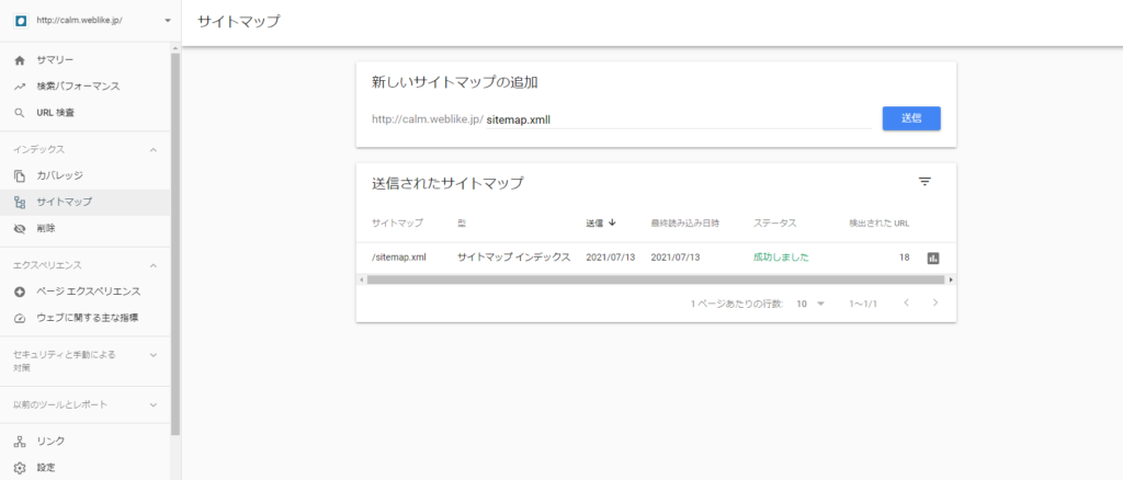 ちなみに前回のSitemap xmlのプラグインを実装して設定を行っていると、sitemap.xmlと「新しいサイトマップの追加」欄で「sitemap.xml」と打つことで認証されるという仕組みとなります。