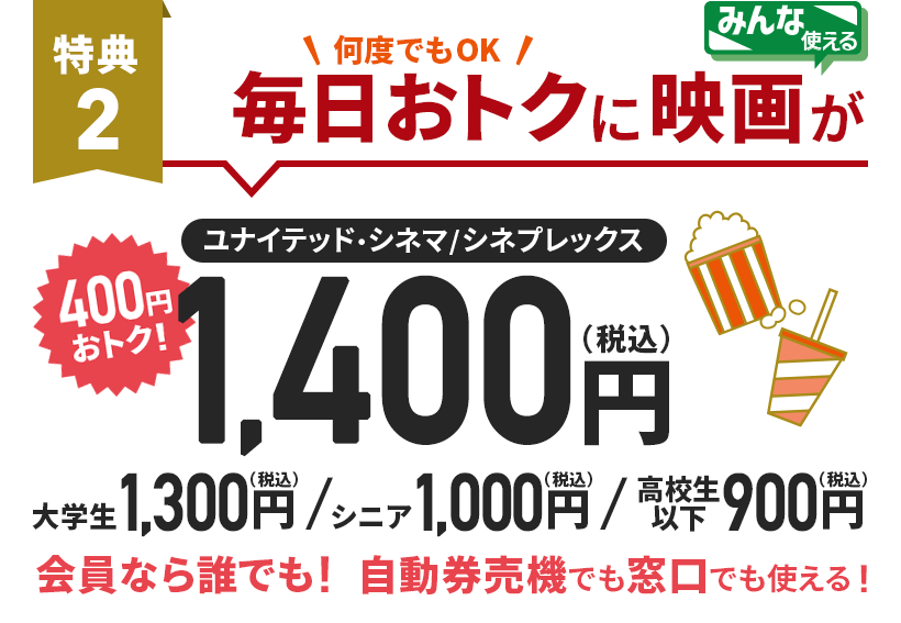毎日おトク!映画鑑賞料金1,800円(税込)が1,400円(税込)に!
