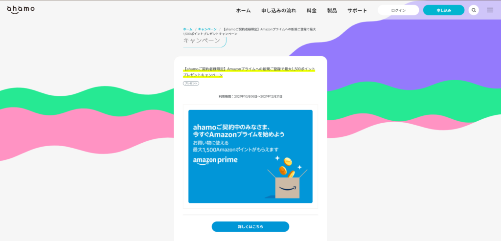 ・docomoのahamoプランに契約しているお客様がキャンペーンエントリー期間中にキャンペーンにエントリーし、Amazonプライム会員になり(無料体験を含む)、その後ポイント付与期間にAmazonプライム会員であり続けた場合、Amazonポイントを最大1,500ポイントを付与します。